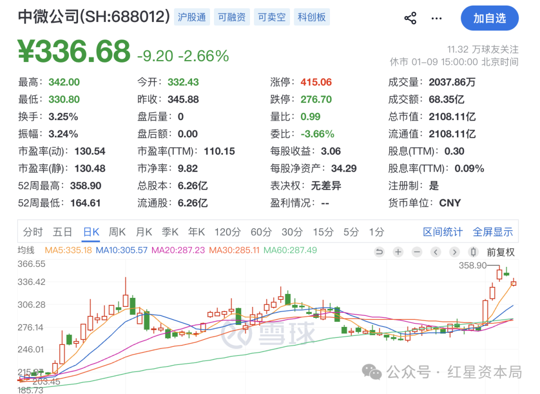 截至1月9日收盘,中微公司股价报336.68元/股,总市值为2108亿元。尹志尧拟减持股票市值约为9764万元,目前中微公司市值为2108亿元。